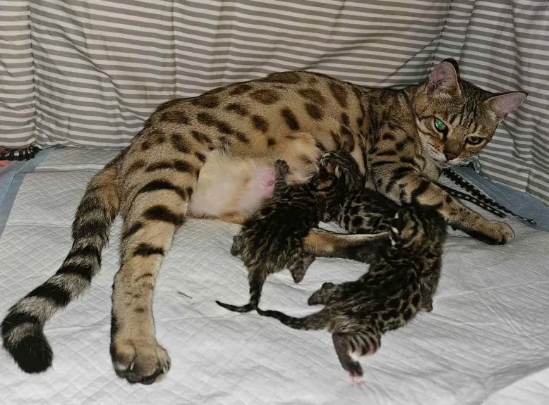 Nos 3 bébés Bengals se portent à merveille, ils commencent tout doucement à ouvrir leurs petits yeux et pourront bientôt voir le monde en grand !
