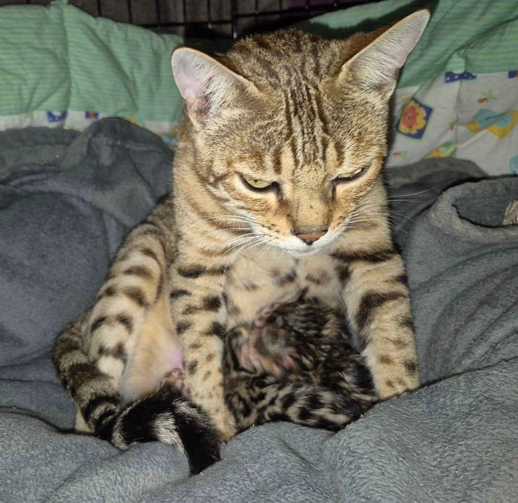 Maman Sweety de la Hillane et Osiris Marie Bengal, Bengals Brown et LOOF, ont la joie de vous annoncer la naissance de leurs 4 bébés nés ce week-end !
