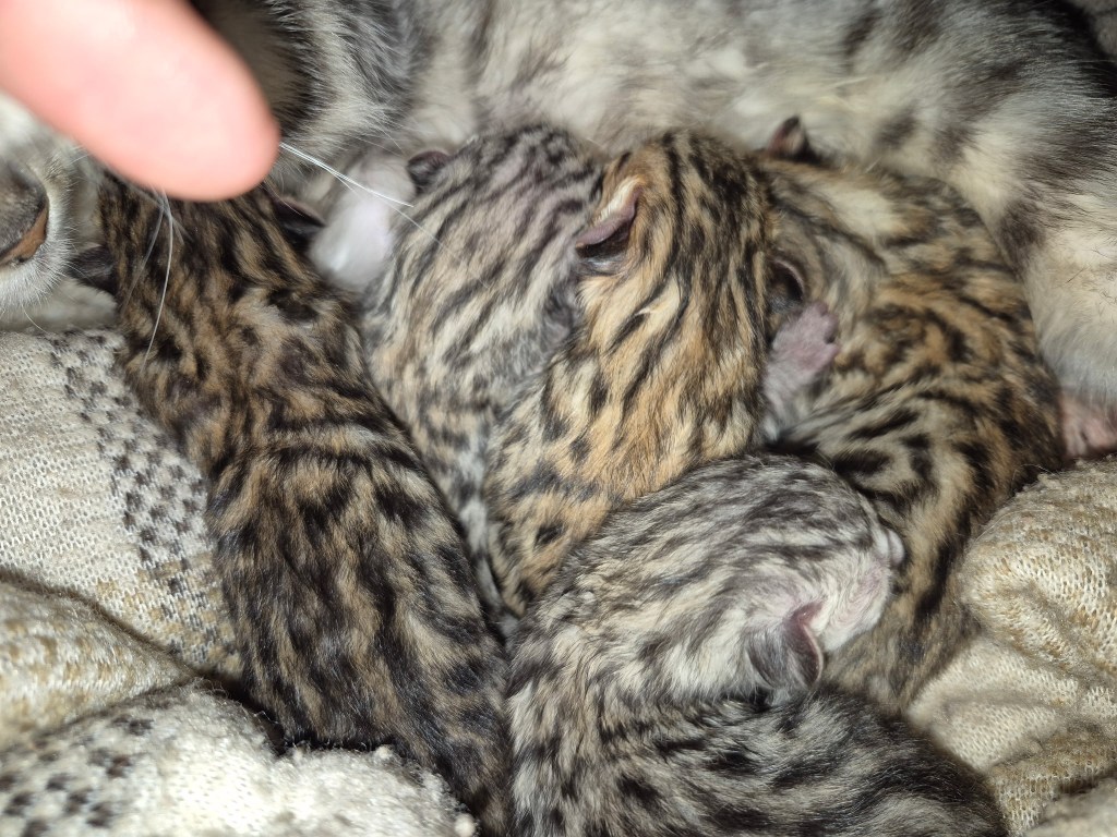 En effet, après de longues heures de mise bas Umma a donné naissance à 5 jolis bébés Bengals entre la soirée et la nuit de jeudi à vendredi dernier. Tout le monde va très bien et prend un repos bien mérité…